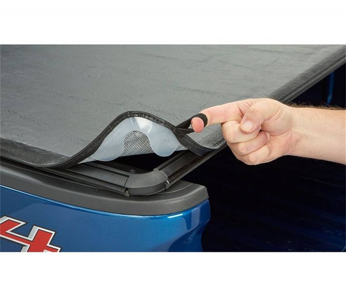 - Tonneau sits on top of bed and secures to rail with hook and loop fastener