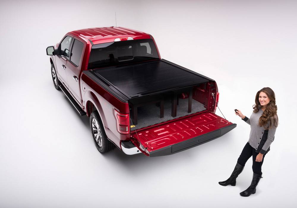Utilizing a remote keyfob, this retractable pickup bed cover opens and closes at the touch of a button. Wireless operation allows it to easily open and close, and an electromagnetic brake allows it to lock in any position along the rail. The operation and installation process remains the same as the standard RetraxONE cover with one exception; the electrical components require a connection to the battery. The PowertraxONE also has an integrated cargo light on the canister that is operated by the remote keyfob, and includes an auto shutoff feature. The wiring information is included with the standard installation instructions.