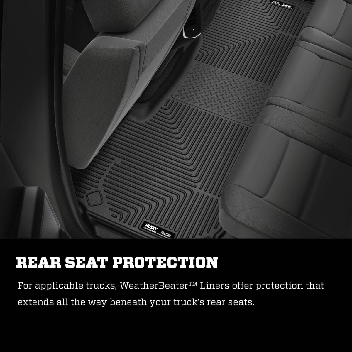 - For applicable trucks, WeatherBeater™ Liners offer protection that extends all the way to your rear seats. So go ahead, lift the seats and leave them up, load after load. Husky's got your floors, and your back, no matter what the road brings your way.